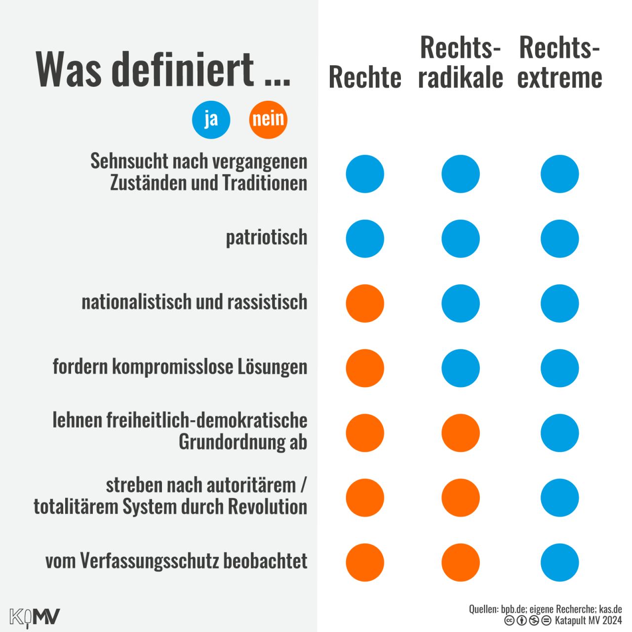 - In vielen Kontexten meint „rechts“ konservative bis nationalistische Positionen, „rechtsradikal“ radikale Programmatiken, „rechtsextrem“ die Ablehnung demokratischer Grundnormen und oft völkische Ordnungsentwürfe